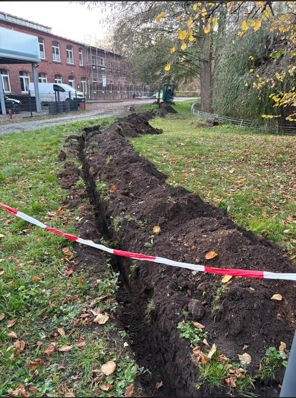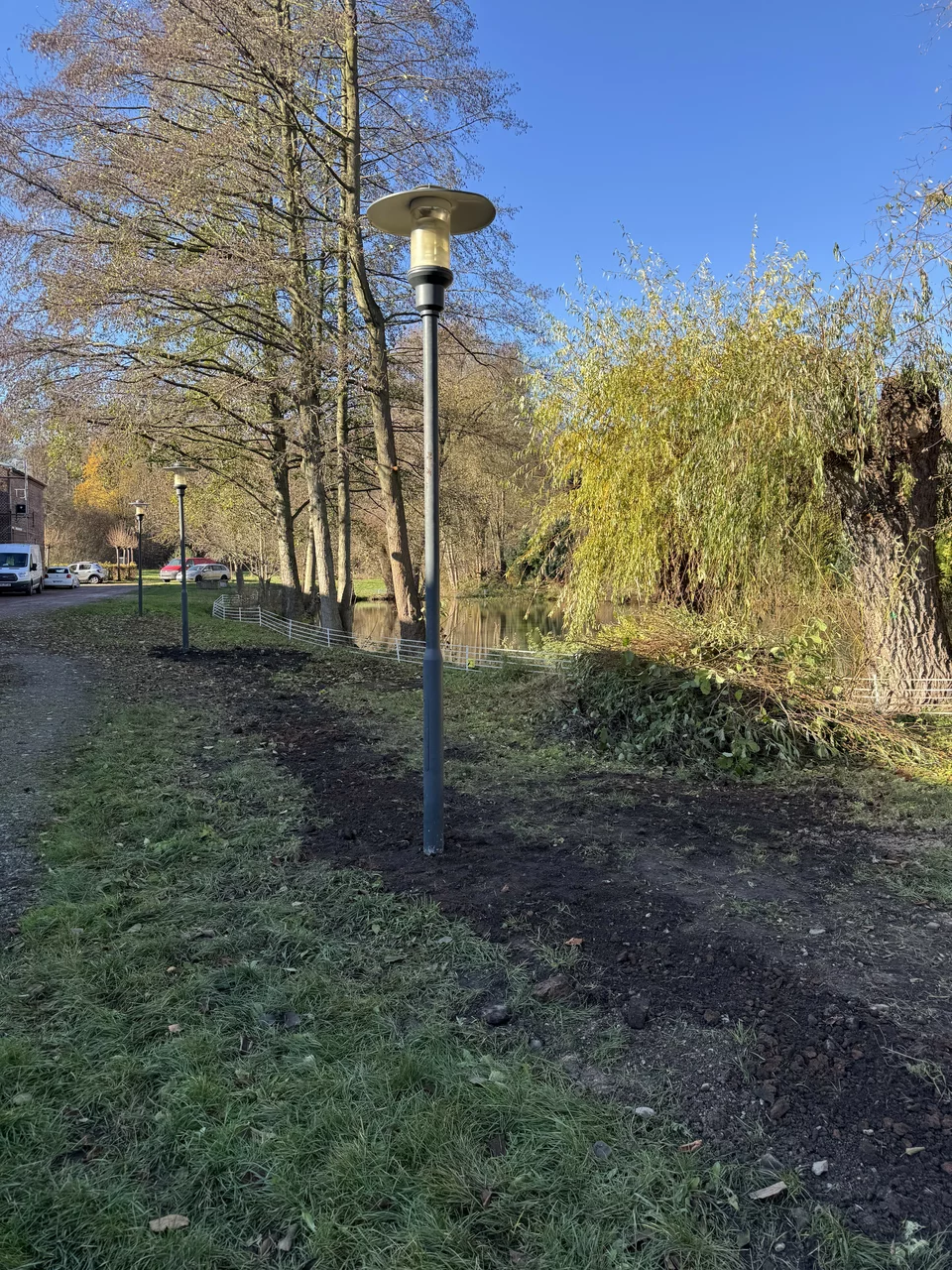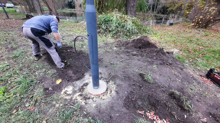 Die letzten drei Straßenlampen sollen gesetzt werden. Einsatz von „schweren Gerät“.